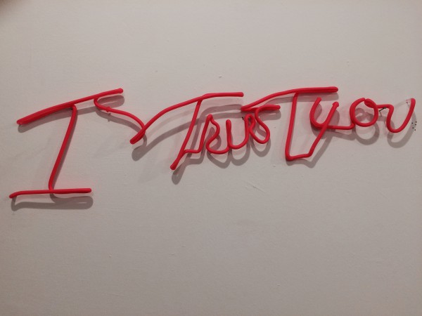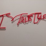 Les Lettres sont formées à partir de tubes en verre-acrylique et sont peintes à la bombe dans des teintes fluorescentes. Les endroits qui ne sont pas censé s’illuminer viennent être peints en noir. Ainsi cette contrefaçon nous renvoie aux Néons que nous connaissons des Enseignes publicitaires.