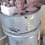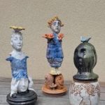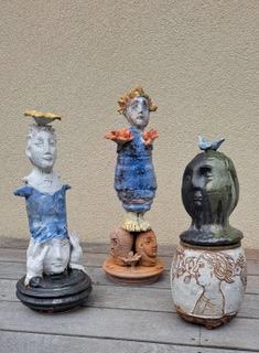 EpouvanterresSérie de terres cuites de plein-airLes pièces font écho aux tuiles faîtières populaires de nos toits ainsi qu’auxépouvantails de nos jardins, cauchemars des oiseaux.Les argiles tournées et modelées sont travaillées avec la gestuelle traditionnelle despotiers de terre.Les émaux sont composés majoritairement de Lœss locaux (limon calcaire très findéposé par les vents).