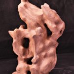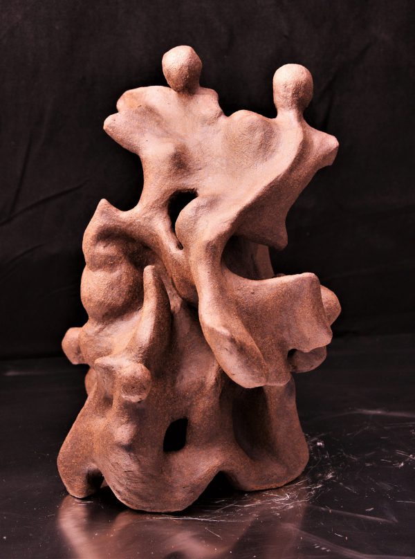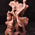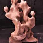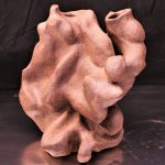 LA TRACE ET LA MÉMOIRE Quand on évoque le tryptique ; la vue, le regard, la vision, on pourrait y rajouter la notion de Temps. Le thème de la Mémoire et de la Trace est le fruit de nombreuses pérégrinations, de temps de contemplation, d’observations. Ce qui mène à une vision des éléments, de nous-mêmes. Il faut que la vue devienne active pour pleinement prendre ce qui nous est offert. Les sculptures organiques d’Auguste Vonville suggèrent avant tout. Elles sont un miroir qui nous renvoient à des formes qui passent du minéral au végétal et de l’animal à l’humain, mais qui inspirent un dépassement de ces statuts physiques. A chacun la liberté de l’interprétation, d’entrer dans son lot d’images, dans son ou ses histoires. Regarder, c’est se relier aux éléments, et d’une façon ou d’une autre, on entre en Contemplation. « Et c’est là qu’on entre dans le « Voir », ce qui nous permet d’avoir une « Vision ». Dès lors apparait la notion d’appartenance à un monde impalpable, qui va du micro au macro, et qui nous entraine dans des spirales infinies », confirme le céramiste. C’est ainsi qu’il évoque les quatre éléments chers à Gaston Bachelard. Ils sont omniprésents ; l’argile/terre pour sculpter, l’eau pour triturer celle-ci, le feu qui permet la cuisson et l’air qui permet au feu d’exister. Auguste Vonville, à travers son regard porté vers la Nature, dans le sens large du terme, affine sa réflexion sur la place qu’occupe l’Humain dans cette « organisation » mystérieuse.