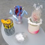 Elle explore et joue avec cet univers matière, fascinée par des riens : d’un bout de plastique à des déchets citron orange ou des capsules, pierres et bouts de ficelle…