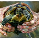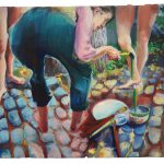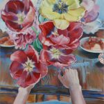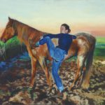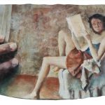 Parce qu’au commencement, c’est un gouffre à franchir: de moi à la peinture, au geste de peindre. Ma peinture commence en écartant tous les autres chemins possibles. Alors un fil, et je me cramponne. J’ai plusieurs peintures en cours, qui finissent par être abandonnées, remplacées par d’autres, auparavant délaissées. Elles refont surface de nombreuse fois. Travail au long cours, à la limite de l’absurdité. Ce sont essentiellement des petits formats sur bois ou ardoise. Ces supports m’apportent la concentration et m’amènent à une densité, que j’observe parfois comme un point trop dense, sans échappée. Où est l’image? Où est la peinture? Je peins et dis « surface ». Je me colle à la paroi, comme une pulsion avec le désir de la franchir. Je suis Narcisse et je repeins Adam et Eve. La peinture me lie à ma langue, elle est ma matière à penser, ma présence au monde.