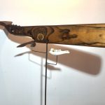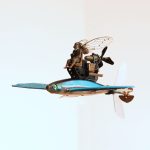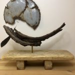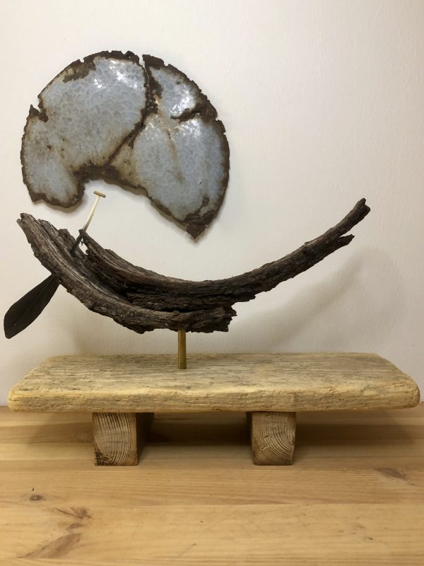 Le travail de création de Ferdinan Blondin prend naissance dans le Var, il y a une dizaine d’années, sur les rivages de la Presqu’île de Giens, aux portes du monde marin. C’est les pieds dans le sable ou sur une planche de « Stand Up Paddle » que cet architecte de métier se métamorphose en glaneur de ce que le ressac lui dépose comme des offrandes. C’est ensuite dans son atelier où les matières et les formes l’entrainent vers des évasions plastiques qui n’appartiennent qu’à lui. Les bois flottés d’abord, mais aussi planches de bateau échoué aux couleurs patinées par le sel, plumes d’oiseau, objets délaissés par les humains ou insectes séchés par le soleil sont subtilement combinés et composés en images poétiques. Son approche peut rappeler certaines pratiques appréciées dans les « arts premiers », dans certaines ethnies africaines ou encore tribus Esquimaux, Inuit, Yup’ik, du Grand Nord qui composent leur art avec ce que l’environnement peut leur procurer. L’année 2023 marque un tournant dans son activité : Ferdinan rejoint Haguenau, sa ville natale. L’artiste y installe son atelier et, très vite, c’est dans la forêt de Haguenau qu’il va nourrir sa créativité. Cette aire de nature et de biodiversité lui offre inspirations et matériaux propices à la création de nouvelles constructions. Celles-ci s’inspirent de son amour du bois et font toujours référence à son expérience endémique de lieux particuliers proches de l’endroit où il s’est établi. De vieilles souches de bois, délaissés de coupe de bucheronnage ou coins de bois, champignons constituent ses nouvelles prises. Chacune d’entre elles est la source d’un nouvel essai poétique, spécifique, dicté par la patine, la forme que les éléments, la nature ou l’homme lui ont conférées. Chaque trouvaille devient le support d’une expression intime, en quête de sens et d’harmonie. Ferdinan développe tout un bestiaire, révèle des créatures, crée des scènes, des paysages ou encore quelques engins à dimensions réduites…il endosse les rôles d’embaumeur, paléontologue, maquettiste, assembleur, peintre, sculpteur, ingénieur hydronautique, narrateur, voyeur…et témoigne ainsi de son insatiable curiosité à multiplier les pratiques au service de son art. Chaque pièce est finalisée par un texte qui expose ses intentions, pensées parfois enthousiastes, à l’idée qu’on puisse parfaitement s’enchanter du monde dans lequel on vit, ou parfois, désabusées par la direction dans lequel ce monde va. Tenant à la fois de la peinture et de la sculpture, ses étonnantes constructions enchantent et intriguent par leurs complexités énigmatiques en se jouant des échelles entre l’infiniment grand et la miniature. L’univers imaginaire de Ferdinan Blondin fait comprendre, avec jubilation, combien une modeste collecte d’objets, sert l’ambition d’un « enfant-capitaine » capable à lui seul de réinventer tout un monde, en bord de mer ou en forêt et son aspiration à être à la fois le rêveur et le bâtisseur de sa réalité.