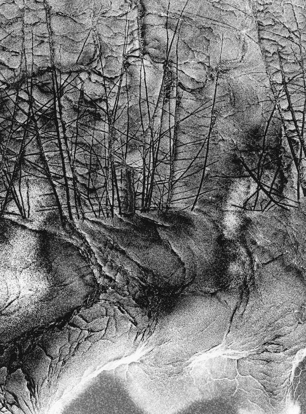 Il s’agit aussi de photographies figuratives : un arbre, justement, sert de point de départ, puis creusé, érodé par l’action de la lumière que redouble celle des acides, il mute soudain dans une autre espèce et donc un autre dessin : cela peut être le fourmillement des bacilles dans un bouillon ou les galeries hasardeuses des vers dans la terre.