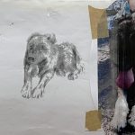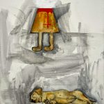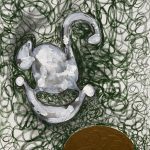 Die schwarze Linie steht immer wieder im Zweifel von tip-ex-Spuren, virtuose Bewegung wird von tastendem Suchen ins Stocken gebracht. Mancher Streifzug durch ein Stücklein Tiefe bleibt unschlüssig, manchmal aber findet eine Linie traumwandlerisch zu ihrem Anfang zurück. ….