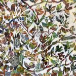 Elle découpe des fragments d’images dans les journaux, fixe des instants du quotidien et de la vie : lessive qui sèche, jeux d’enfants éparpillés sur le sol, cartes routières, fleurs, volcans, poissons, oiseaux…