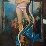 Elle utilise l’acrylique ainsi que les techniques mixtes dans ses peintures. Mélanger les techniques apporte une certaine profondeur qu’elle recherche.