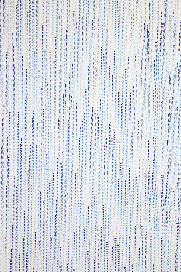 Chaque point, chaque goutte de peinture délicatement posée par un fin pinceau, correspond à un instant précis et renvoie au point suivant, avec chaque fois un peu moins de matière (jusqu’à son extinction ?). Mais, nous en avons fait l’expérience, le temps, lui, n’a pas de fin. « … ».