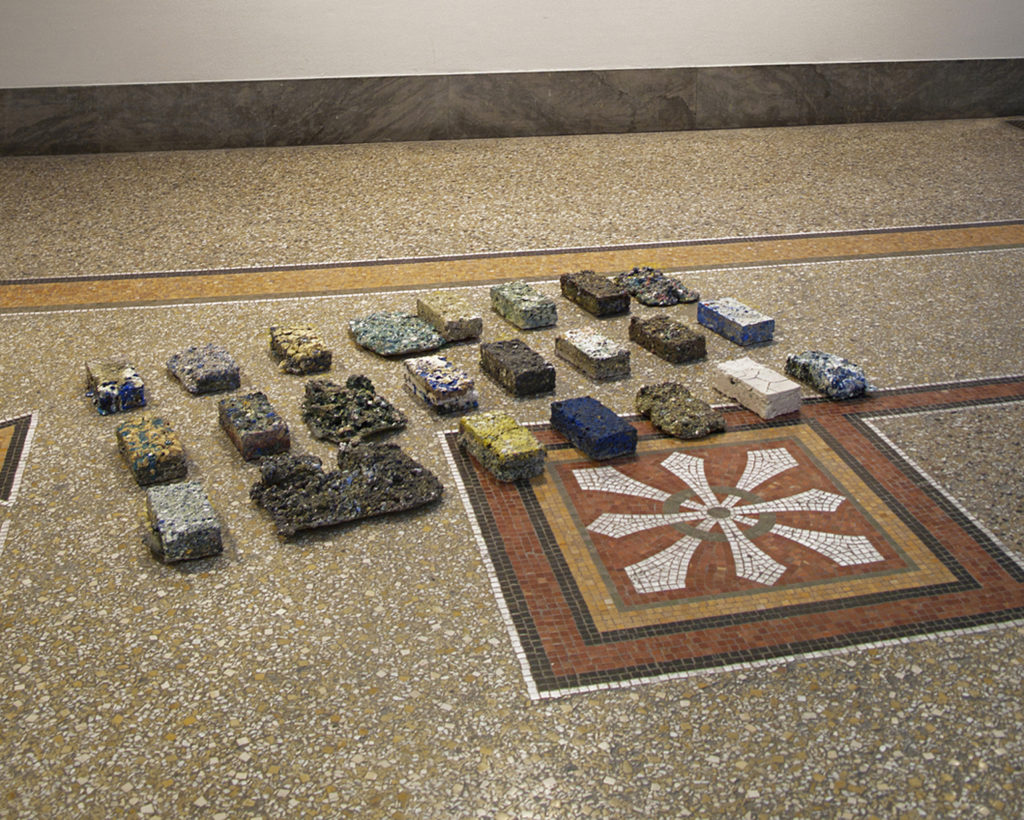 Image précédenteImage suivante Another Brick III, émaux (argiles, minéraux, oxydes métalliques…), installation à dimensions variables, en fonction des lieux. 91 briques à ce jour (08/07/18).