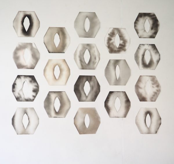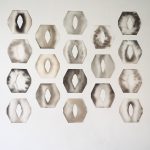 Christiane Maier Reinhard: Aktuell entwickelt sich meine Arbeit in drei Werkgruppen. (1) Die «Konstellationen» sind Arbeiten auf Glasvlies, Gruppierungen von Einzelelementen. Über ein Raster organisiert ermöglichen sie wand-raumbezogene Installationen. Auf dem Glasvlies amorph ausfliessende Tusche steht im Kontrast zur klaren Kontur der geschnittenen Flächen. Ihre Anmutung changiert zwischen rein geometrischer Form, Naturfragment und Körperlichkeit.