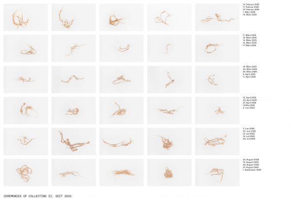 Nadine Bitterli arbeitet an der Schnittstelle von Kunst, Gestaltung und Handwerk. Ihre Praxis ist prozessorientiert und materialbezogen. Ausgangspunkt sind häufig einfache Handlungen wie Zeichnen, Ordnen, Wiederholen oder Spinnen. Aus diesen elementaren Gesten entwickeln sich Arbeiten, die sich mit Zeit, Rhythmus und Verdichtung auseinandersetzen. Geprägt durch ihren Hintergrund in visueller Gestaltung bringt sie ein ausgeprägtes Bewusstsein für Struktur, Komposition und Form in ihre künstlerische Arbeit ein. Diese formale Klarheit wird jedoch bewusst geöffnet: Kontrollierte Systeme treffen auf intuitive, körperliche Prozesse. Es entstehen Spannungsfelder zwischen Ordnung und Auflösung, zwischen Planung und Zufall. In den letzten Jahren hat sie verstärkt handwerkliche Techniken in ihre Praxis integriert. Das Arbeiten mit Fasern, Fäden und textilen Prozessen erweitert ihre Auseinandersetzung mit Linie und Struktur in den Raum. Der Faden wird zur dreidimensionalen Zeichnung, Material zur Spur von Zeit. Auch Papier, serielle Anordnungen und fragmentarische Formate sind wiederkehrende Elemente ihrer Arbeit. Zentral ist nicht das perfekte Resultat, sondern der sichtbare Prozess. Wiederholung erzeugt Rhythmus, kleine Verschiebungen erzeugen Bedeutung. Ihre Arbeiten bewegen sich zwischen Zeichnung, Objekt und installativen Setzungen und laden dazu ein, genau hinzusehen: auf Übergänge, Verdichtungen und leise Veränderungen. Ihre künstlerische Praxis versteht sich als forschend. Sie untersucht, wie Form entsteht – nicht als festgelegtes Ziel, sondern als Ergebnis von Aufmerksamkeit, Handlung und Dauer.