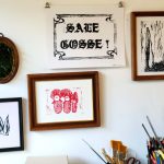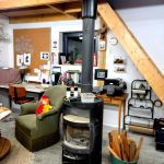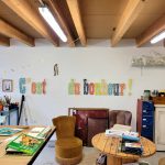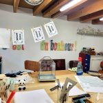 L’Atelier 21:21 était un ancien garage sur la propriété acquise par Marina Krüger en 2017. Des travaux entre 2017 et 2019 lui permettent de faire peau neuve, on remplace une des portes de garage par une grande vitrine donnant sur la rue et invitant la lumière à l’intérieur du nouvel espace de travail ! Une énorme table de travail carrée trône au milieu de la pièce d’environ 40 mètres carré. Un poêle à bois vient réchauffer le lieu depuis l’automne 2023. Dans cet espace de travail, l’artiste peut exploiter la surface des murs pour ses travaux de mosaïques ou autres installations en verre éphémères. Passant d’un médium à un autre, l’espace est pensé pour accueillir toute sorte de travaux : on peut apercevoir des mobiles en vitrail exposés face à la vitrine, sur l’établi en bois, des sculptures et mosaïques sont constamment en construction, la table centrale quant à elle est souvent envahie de gravures (linogravure, gravure sur mdf) et de dessins. Récemment, on peut observer des gaufrages accrochés sur la cimaise de l’atelier. Dans un coin de l’atelier, une petite table est dédiée aux travaux de couture et de reliure. L’atelier possède également un espace de stockage au 1er étage où l’artiste range ses pièces et accumule verre et carrelage de récupération, matière première pour la réalisation de multiples travaux. Des cours d’arts plastiques pour enfants ont déjà été dispensés au sein de ce petit lieu chaleureux. La rue Saint-Jean qui mène au vignoble de Soultz est très fréquentée par des promeneurs curieux qui s’arrêtent fréquemment jeter un œil aux pièces exposées et papoter avec l’artiste en train de travailler.
