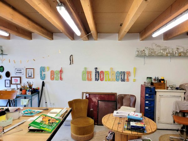 L’Atelier 21:21 était un ancien garage sur la propriété acquise par Marina Krüger en 2017. Des travaux entre 2017 et 2019 lui permettent de faire peau neuve, on remplace une des portes de garage par une grande vitrine donnant sur la rue et invitant la lumière à l’intérieur du nouvel espace de travail ! Une énorme table de travail carrée trône au milieu de la pièce d’environ 40 mètres carré. Un poêle à bois vient réchauffer le lieu depuis l’automne 2023. Dans cet espace de travail, l’artiste peut exploiter la surface des murs pour ses travaux de mosaïques ou autres installations en verre éphémères. Passant d’un médium à un autre, l’espace est pensé pour accueillir toute sorte de travaux : on peut apercevoir des mobiles en vitrail exposés face à la vitrine, sur l’établi en bois, des sculptures et mosaïques sont constamment en construction, la table centrale quant à elle est souvent envahie de gravures (linogravure, gravure sur mdf) et de dessins. Récemment, on peut observer des gaufrages accrochés sur la cimaise de l’atelier. Dans un coin de l’atelier, une petite table est dédiée aux travaux de couture et de reliure. L’atelier possède également un espace de stockage au 1er étage où l’artiste range ses pièces et accumule verre et carrelage de récupération, matière première pour la réalisation de multiples travaux. Des cours d’arts plastiques pour enfants ont déjà été dispensés au sein de ce petit lieu chaleureux. La rue Saint-Jean qui mène au vignoble de Soultz est très fréquentée par des promeneurs curieux qui s’arrêtent fréquemment jeter un œil aux pièces exposées et papoter avec l’artiste en train de travailler.