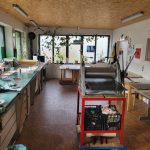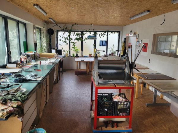Mon atelier chaleureux situé dans un cadre verdoyant et calme est propice à la création et reçoit des personnes intéressées par des cours ou stages de gravure. La pointe -sèche, l’aquatinte, l’eau -forte ou le carborundum y sont enseignés .Le développement de projets personnels ainsi que des échanges pluridisciplinaires dans le domaine des Arts Plastiques accompagnent les séances. D’autres pratiques comme le dessin, l’aquarelle sont possibles.