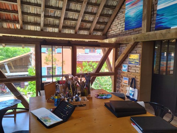 Installée à Reitwiller dans le Kochersberg, en Alsace, Caroline Keller a investi un corps de ferme pour y établir son atelier. Situé au-dessus de l’ancienne étable, cet espace s’ouvre sur une haute charpente. Ce véritable atelier d’artiste, aménagé au fil du temps, permet un travail de peinture sur de grands formats, dans une atmosphère inspirante. La lumière éclaire ce qui était à l’origine un hangar à tabac et maintenant un lieu propice à la création.