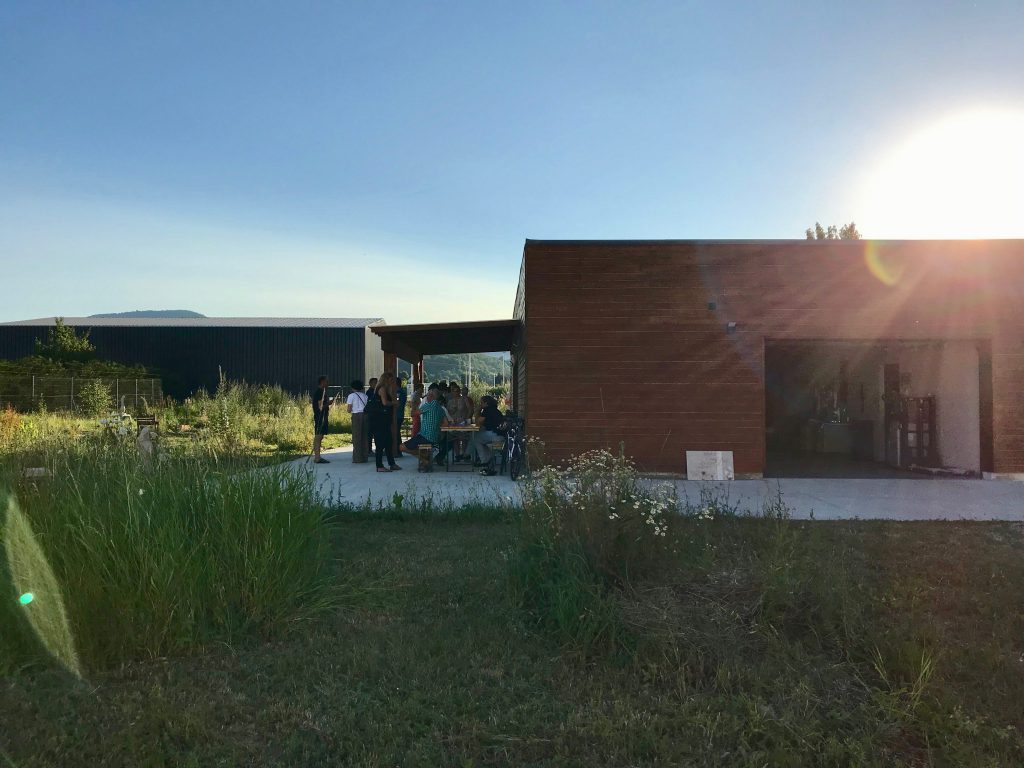 Vue extérieure de l’atelier Val Grav depuis l’entrée du terrain.